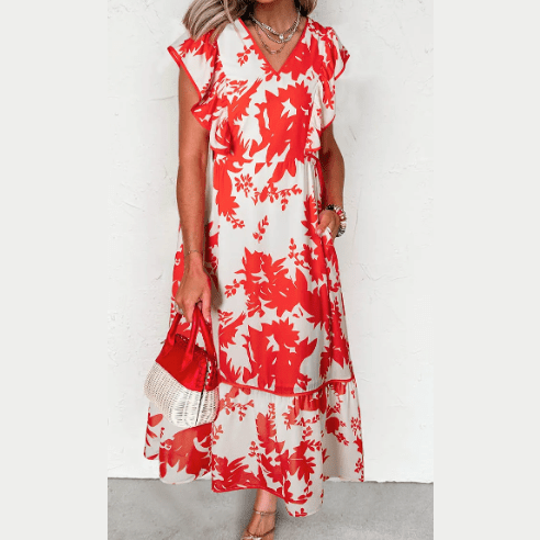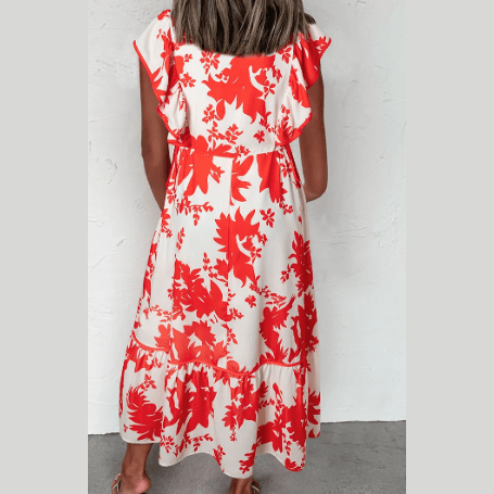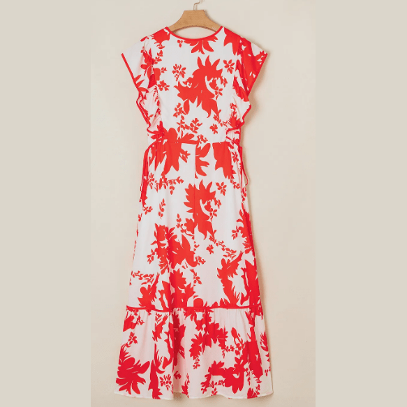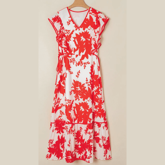 Pandora Red Floral Print Trimmed V Neck Ruffle Sleeve Long Dress