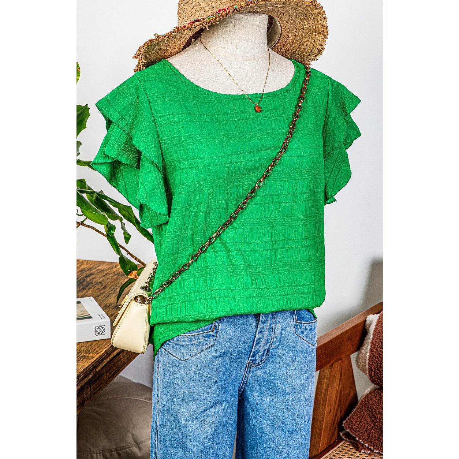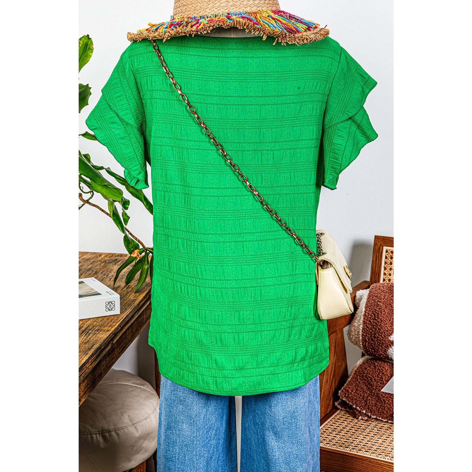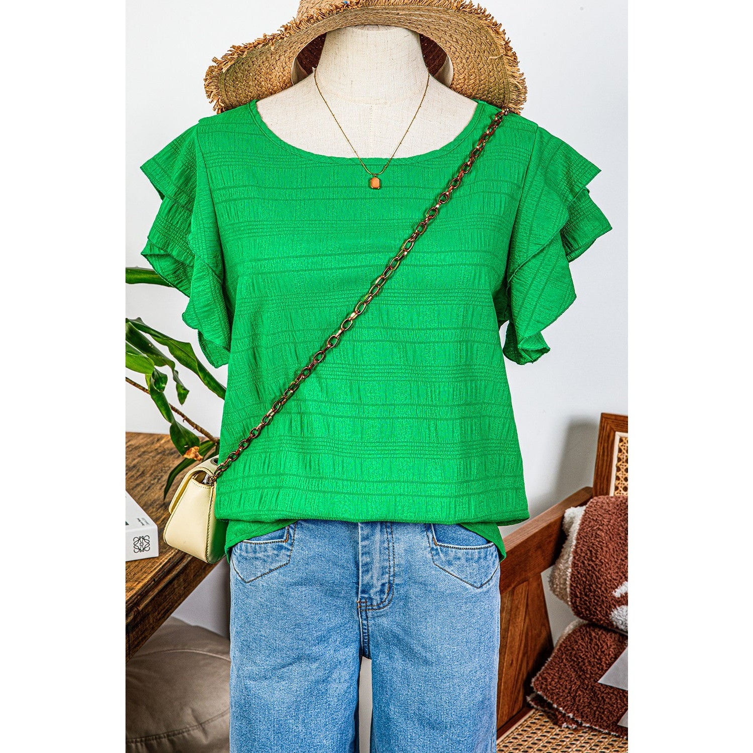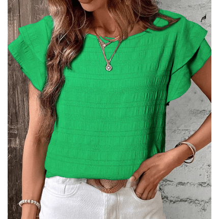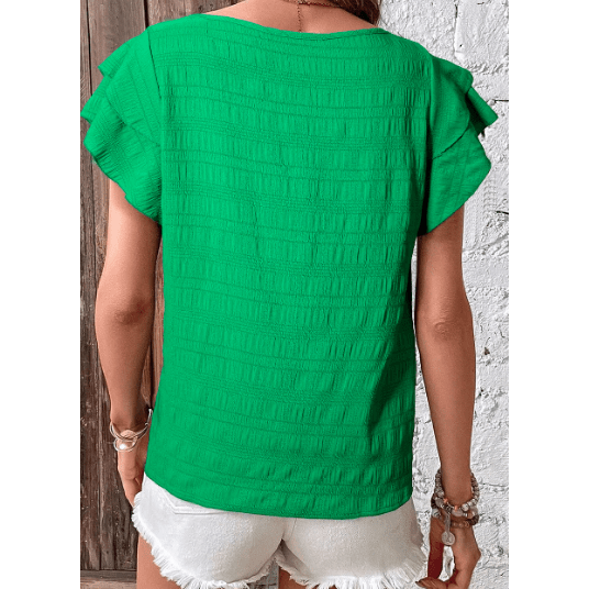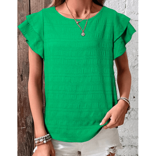 Pauletta Green Textured Ruffled Sleeve Round Neck Top