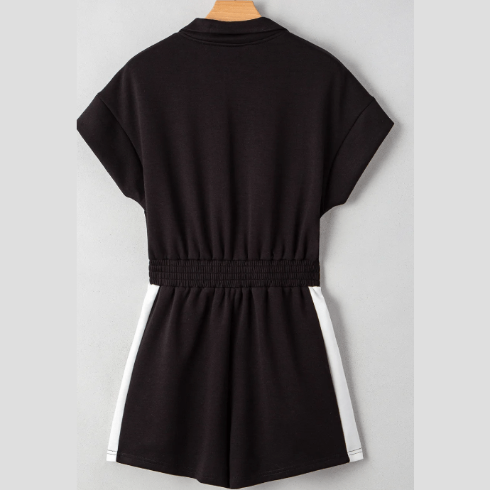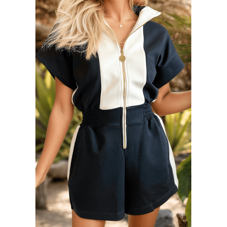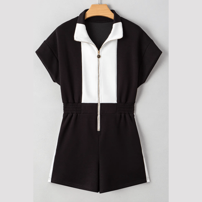 Presleigh Black Contrast Collar Patchwork Zip Front Romper