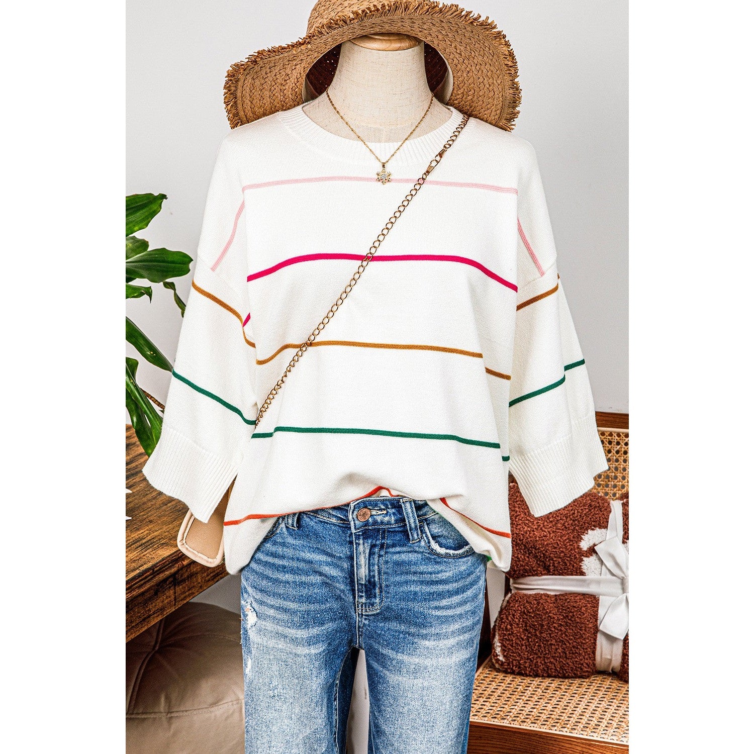 Quinna White Colorblock Striped Half Sleeve Drop Shoulder Sweater