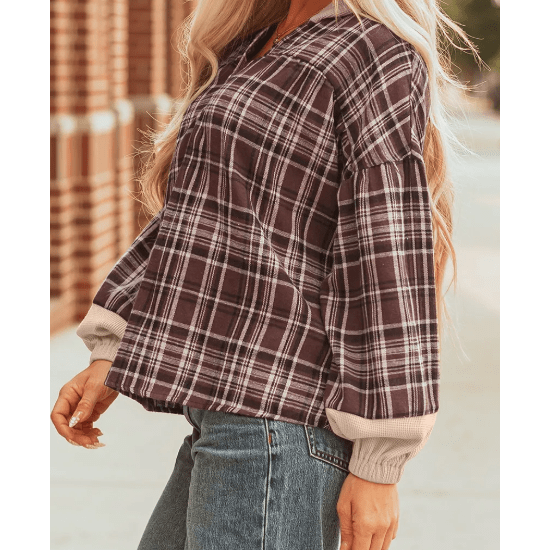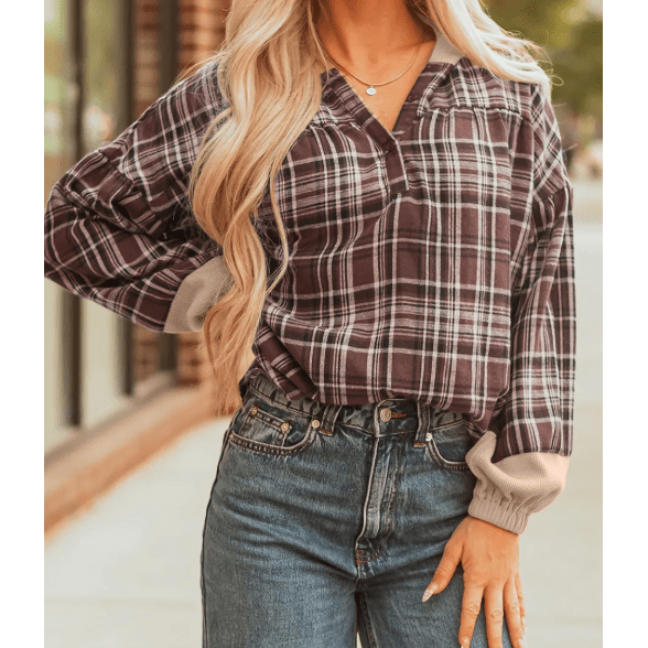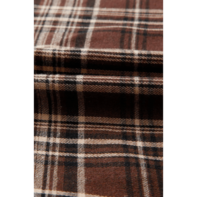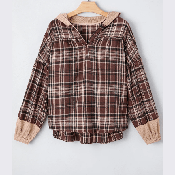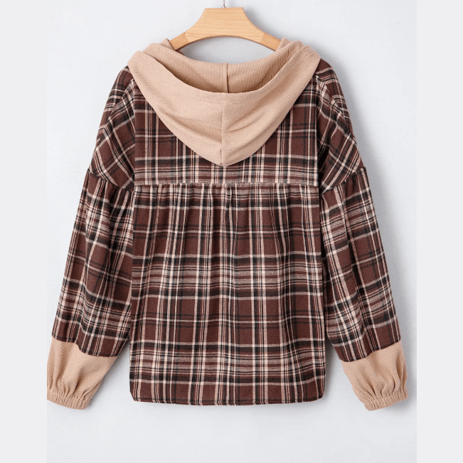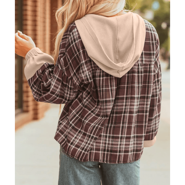 Rayn Brown Plaid Patchwork Long Sleeve Button Hooded Shirt