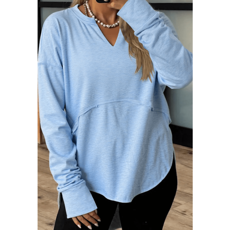 Remy Blue Notched Neck Terry Raw Hem Long Sleeve Top