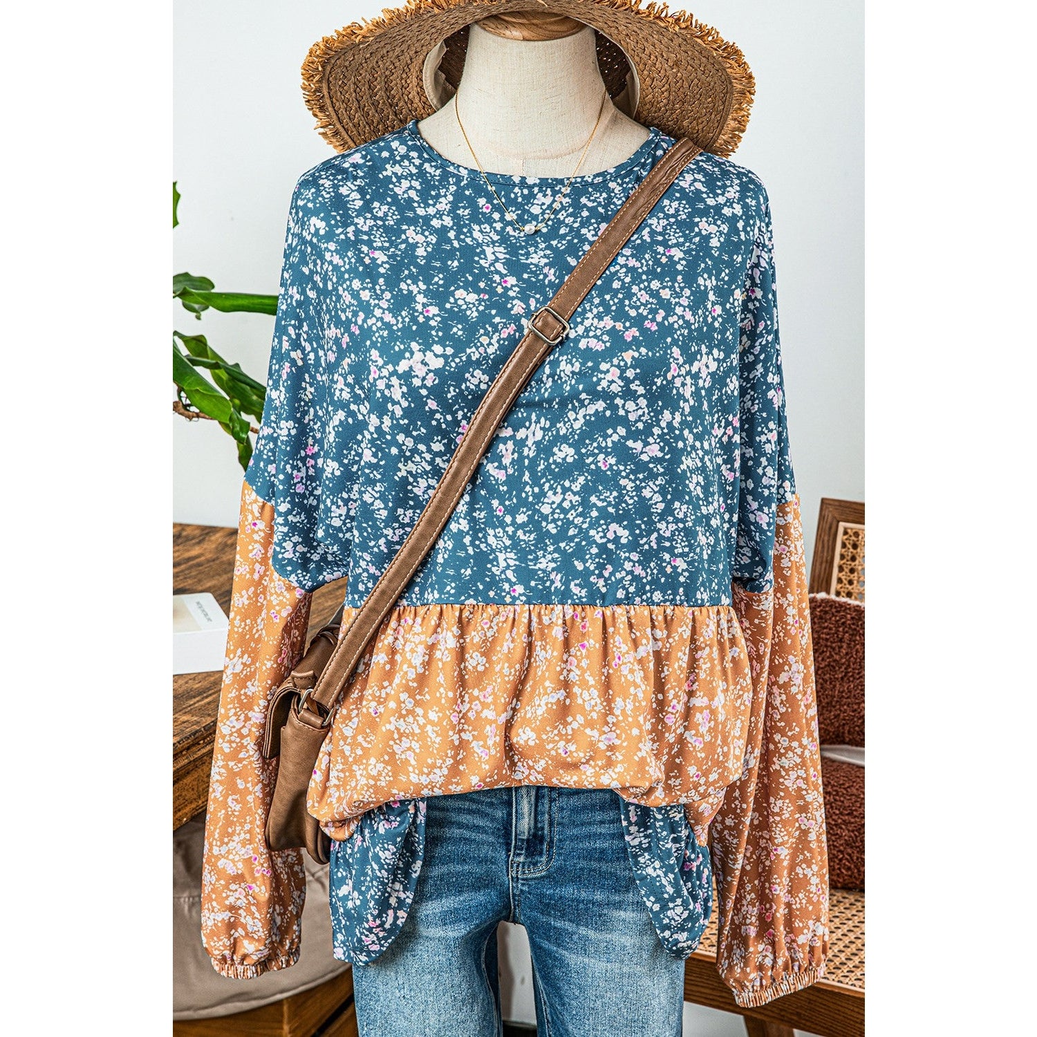 Rosetta Light Blue Floral Color Block Ruffled Hem Round Neck Blouse