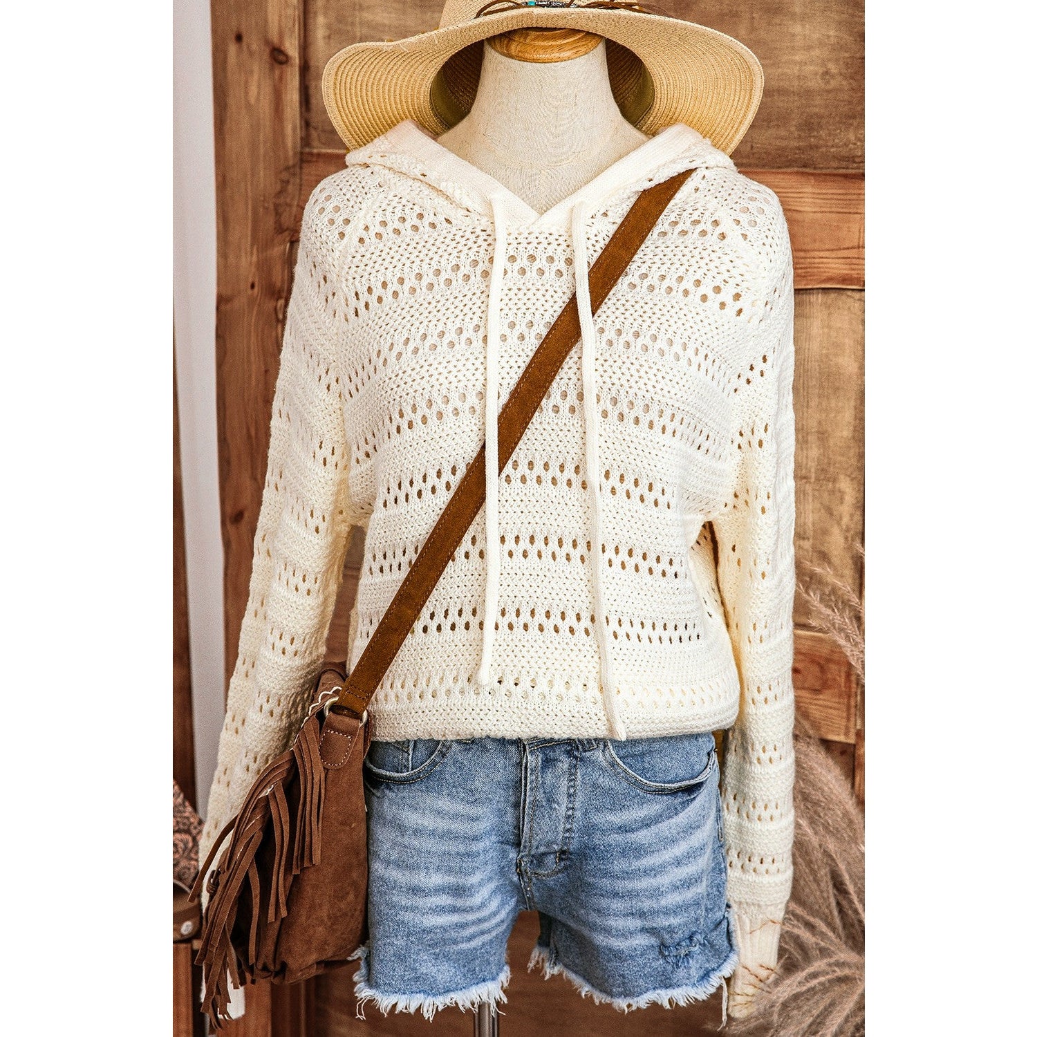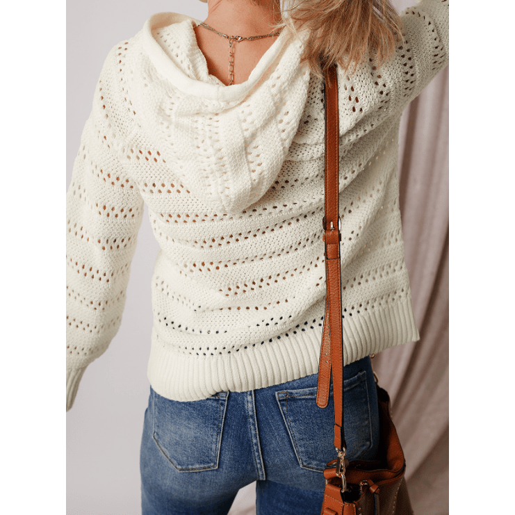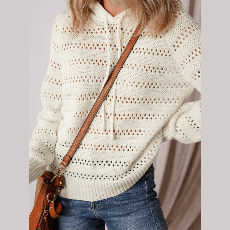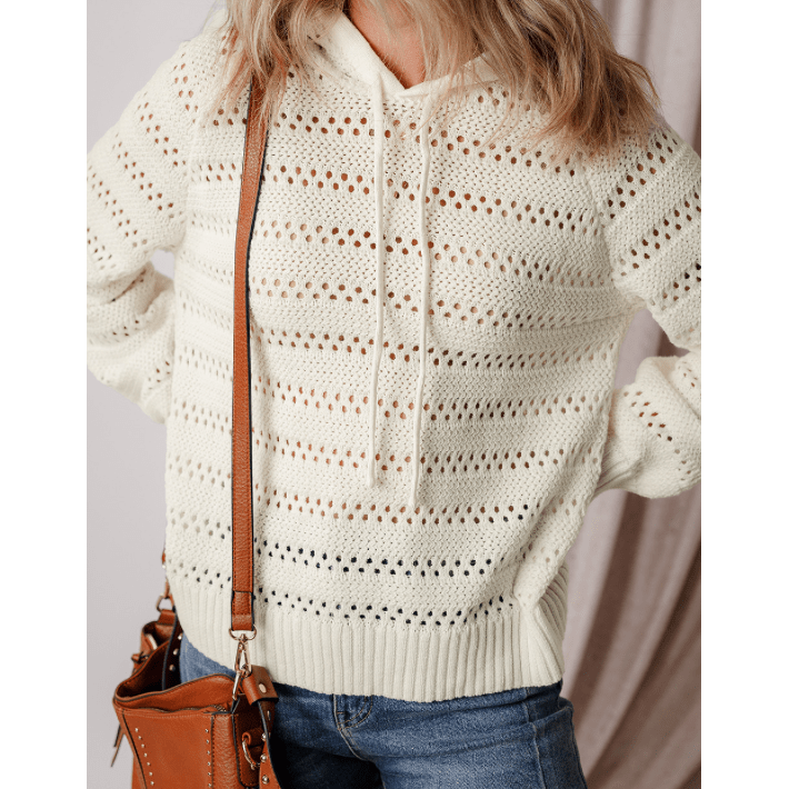 Roshelle White Pointelle Knit Raglan Sleeve Hooded Sweater