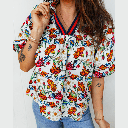 RTS Contrasted V Neckline Floral Puff Short Sleeve Blouse