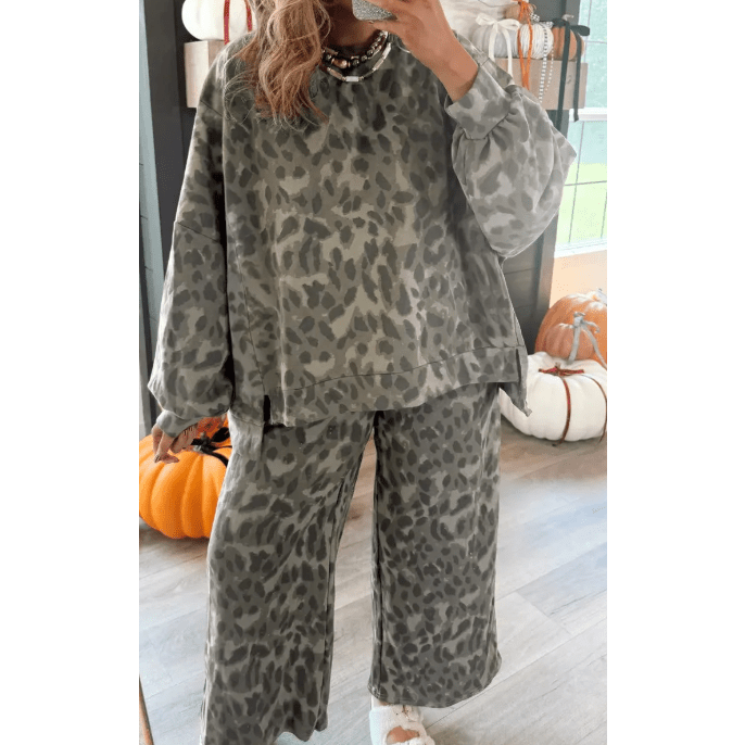 - Make a chic fall statement in this leopard two piece pant set.