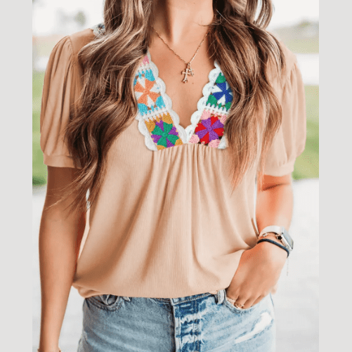 - Exude feminine charm with our Crochet Floral V Neck Textured Short Sleeve Blouse.