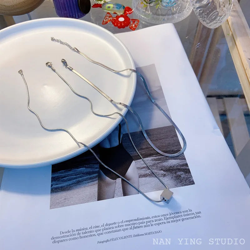 Silver Double Layer Square Pendant Snake Chain Necklace