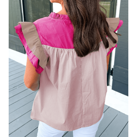 REDUCED!!! Sofia Pink Colorblock Ruffled Sleeve Frill V Neck Blouse REDUCED!!!