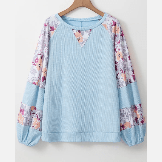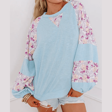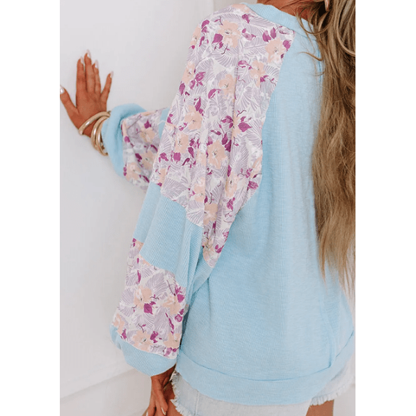 Stacey Blue Textured Floral Patchwork Balloon Sleeve Blouse
