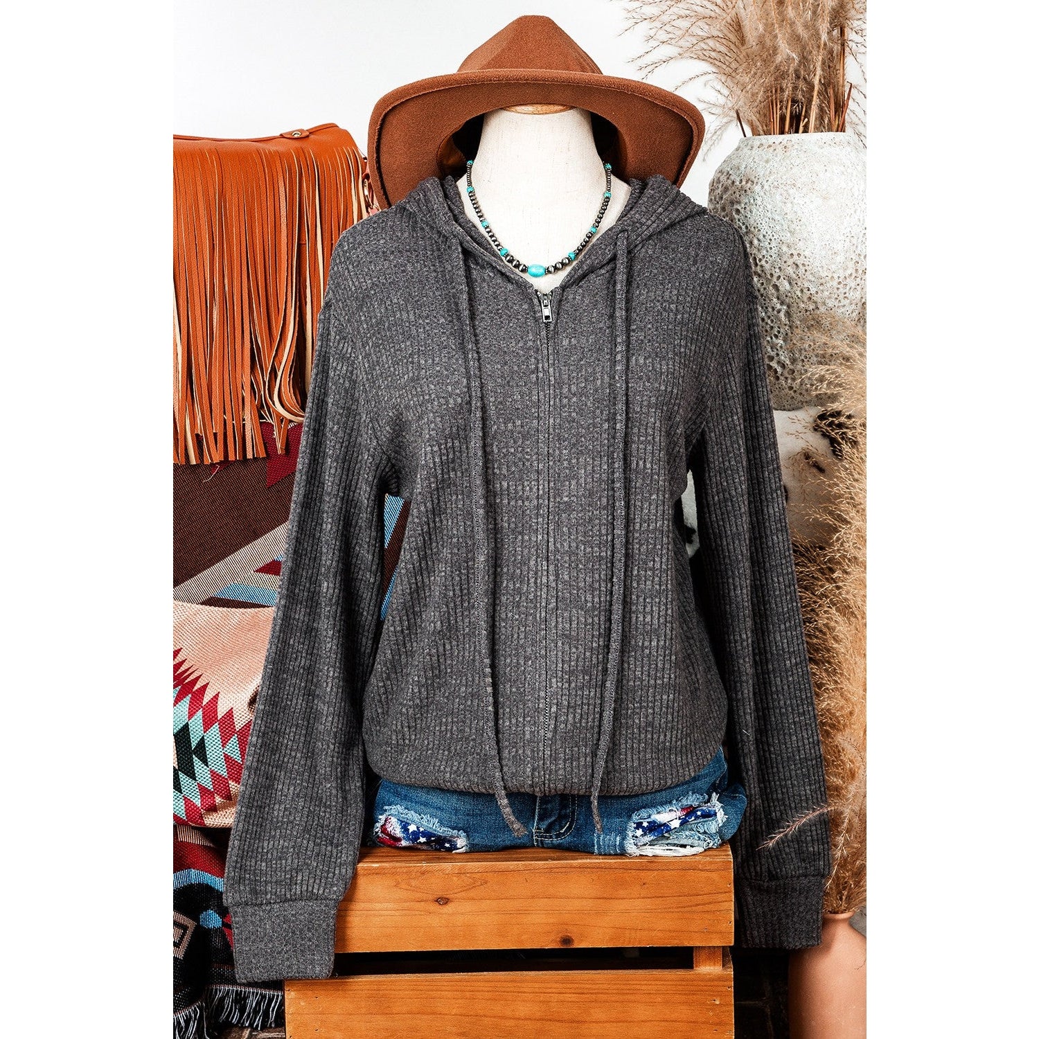 REDUCED!!! Tiffie Charcoal Ribbed Zip Up Front Drawstring Hoodie REDUCED!!!