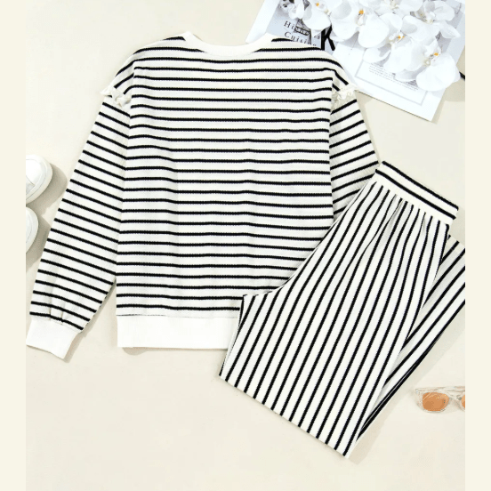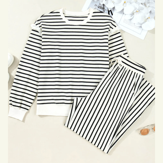Urmi White Stripe Ruffle Trim Drop Shoulder Top Drawstring Loose Pant Set