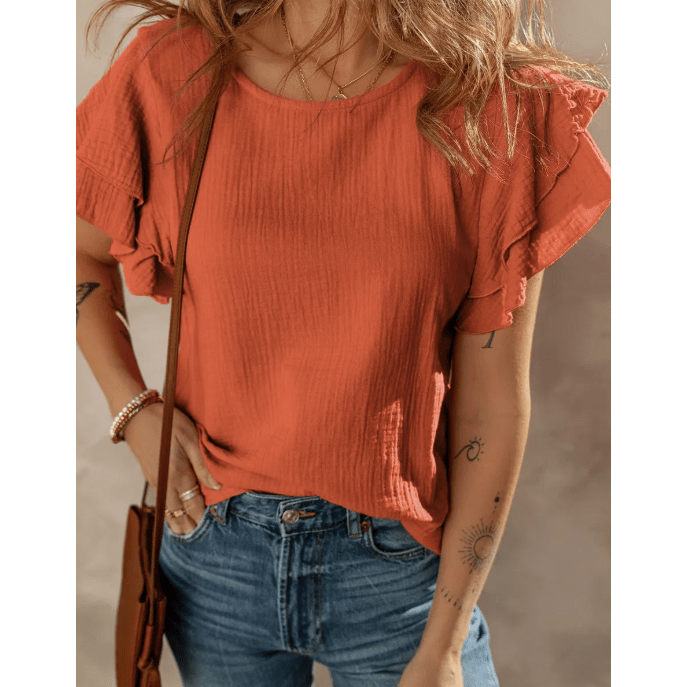 Verena Orange Crinkled Cotton Gauze Ruffle Sleeve Blouse