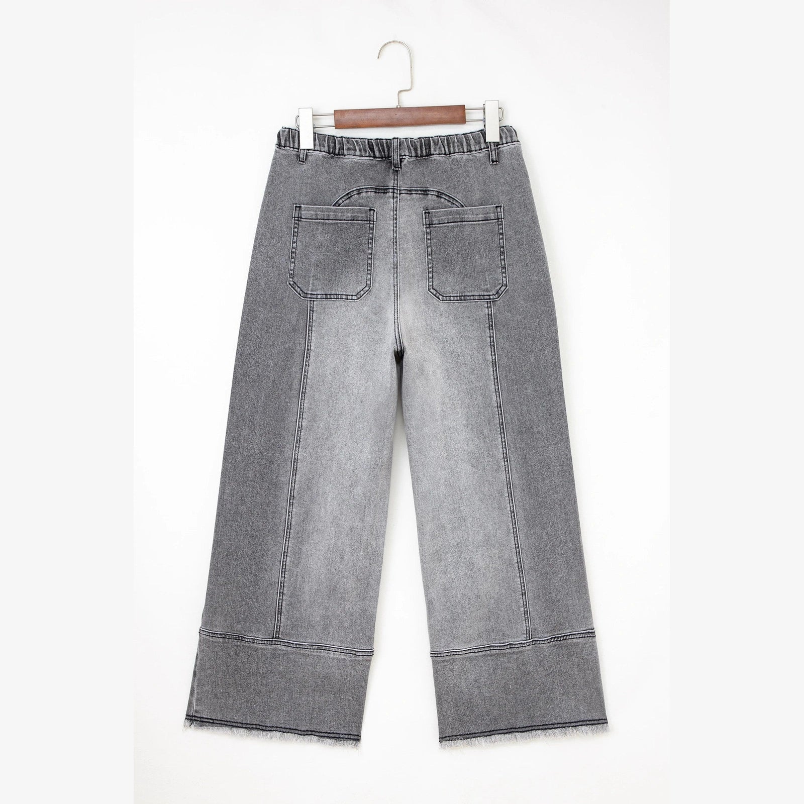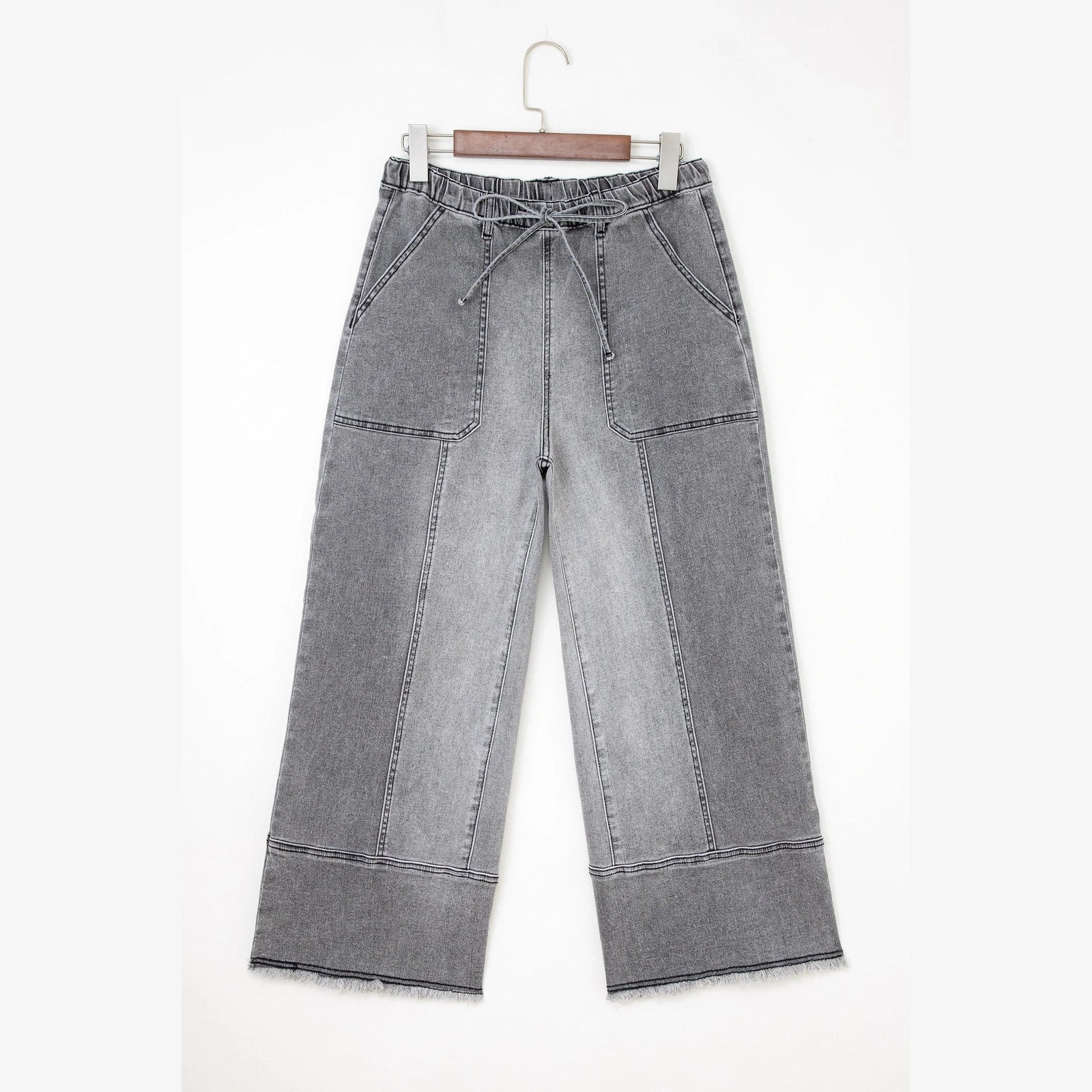 Wandella Grey Drawstring Seam Detail Raw Hem Wide Leg Denim Pants