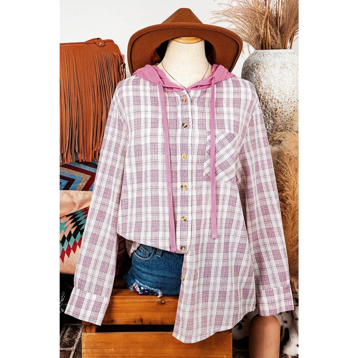Wisteria Pink Checkered Print Loose Fit Buttoned Hooded Shacket